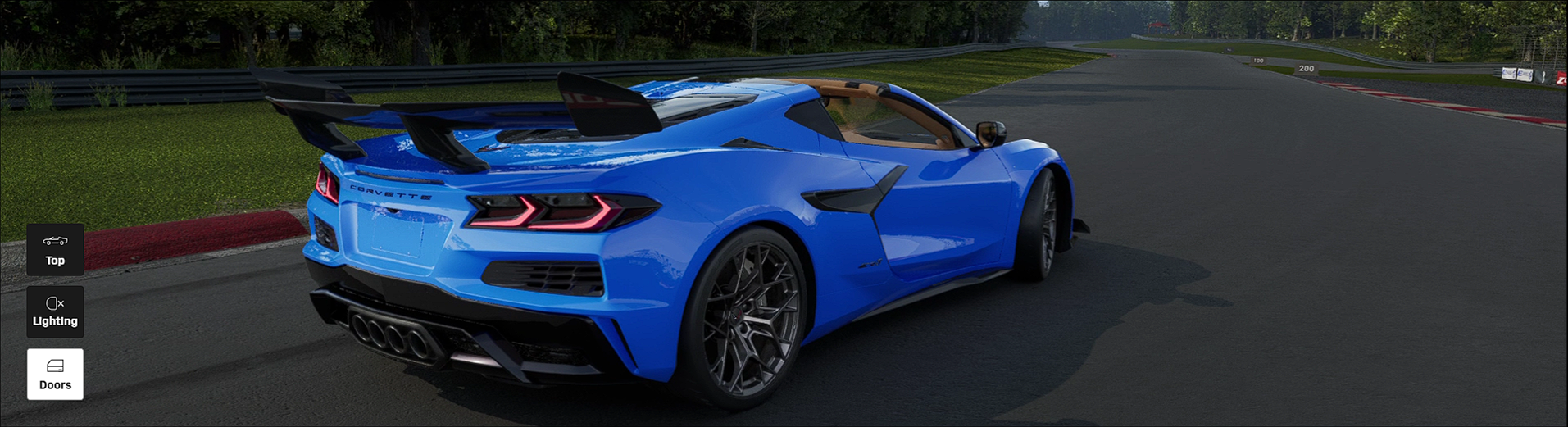 The 2025 Chevrolet Corvette ZR1 Visualization Asset is a fully customizable immersive 3D vehicle configurator that showcases all the ZR1 Corvette options available to customers when building and buying their own unique Corvette. As the Visual Artist leading the development of the visualization asset, I implemented all vehicle 3D data, configuration logic, environment art assets, cameras, and animations in UE5. Vehicle options for the experience include vehicle trims, body colors, wheels, caliper colors, brake rotor sizes, interior color themes, steering wheels, interior and exterior accessories, decals, and aero packages. The configurator uses a UE5 data table logic system that directly reflects real-world vehicle option compatibility that restricts users from creating non-compatible vehicle configuration combinations. The functionality of the experience was built collaboratively between a technical artist and myself using UE5 blueprints. The experience gives the user the option to play several vehicle animations including vehicle lighting, windows, doors, convertible, in addition to cinematic environment animations. Several interactive camera angles are available as options including the main orbit camera, a focused wheel camera, an interior camera, and an aero package fixed angle. The visualization asset includes two environment options, offering two distinct lighting scenarios to showcase how the Corvette ZR1’s various paint options behave in direct sunlight and indoor lighting.